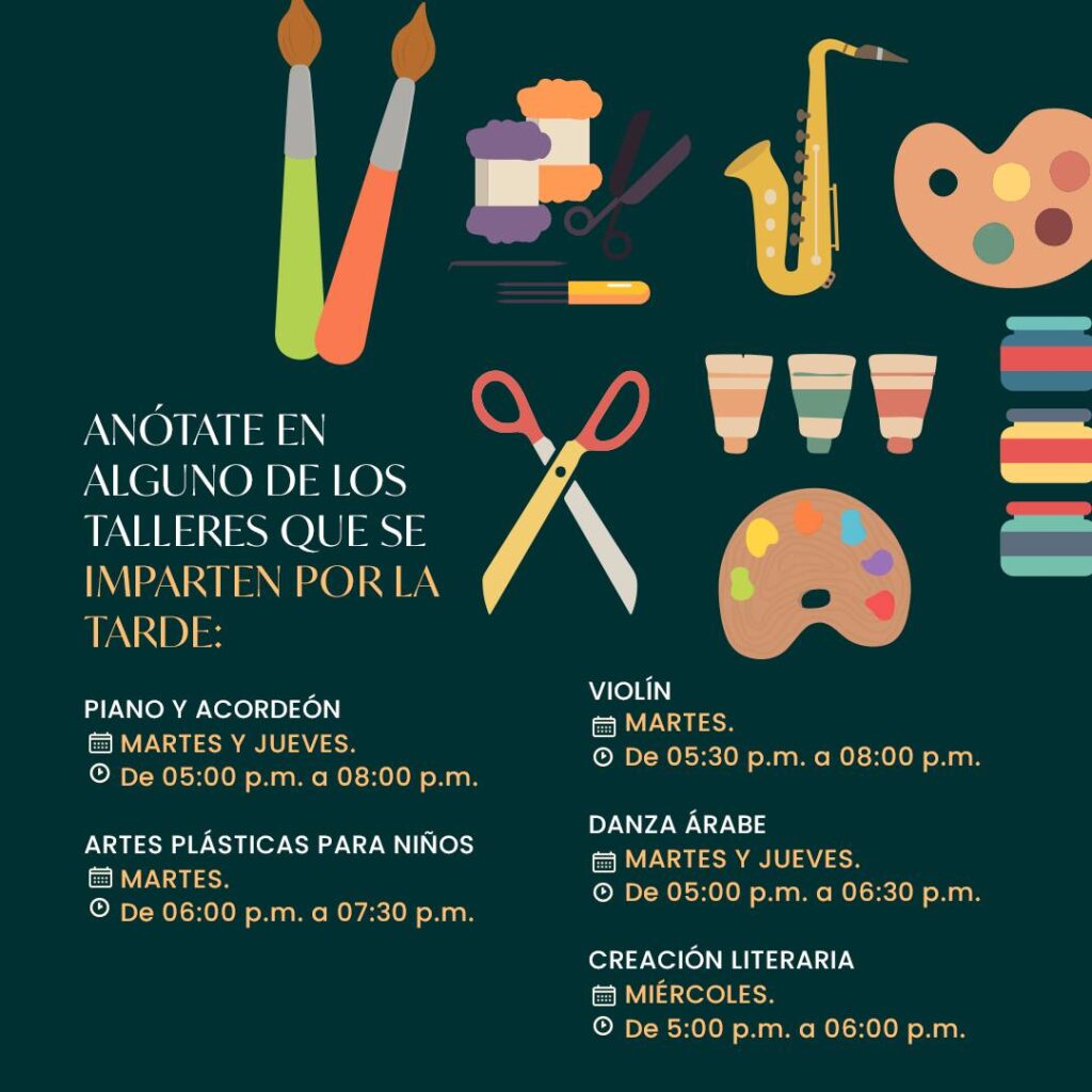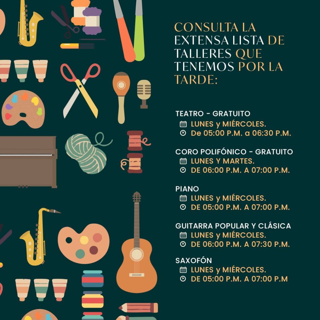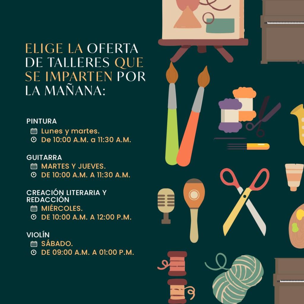 Los interesados podrán elegir entre disciplinas como pintura, guitarra, ballet, literatura, danza folclórica, teatro, canto y muchas más, con el acompañamiento de instructores calificados en un entorno seguro y motivador.
