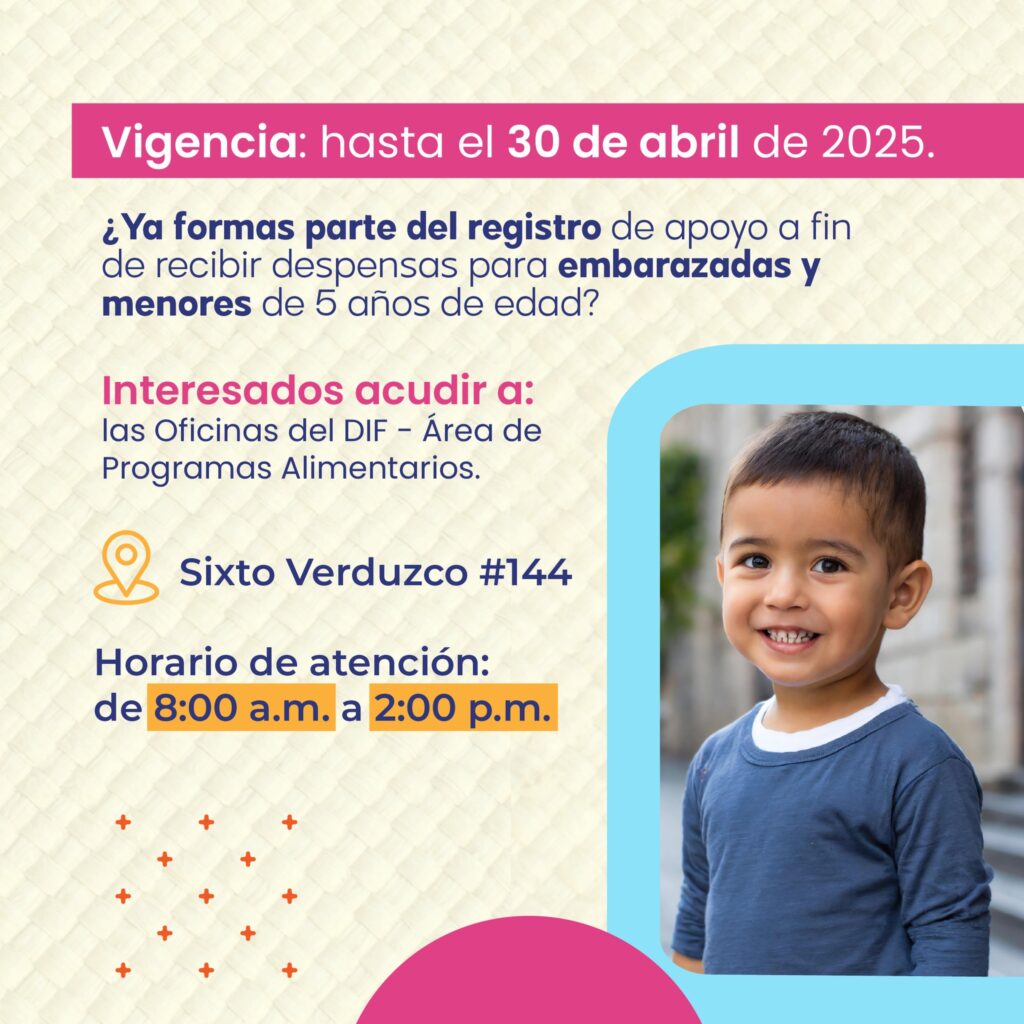 Sahuayo, Michoacán. – Con el compromiso de mejorar la calidad de vida de las familias sahuayenses, el Sistema DIF Sahuayo, bajo el lema “Poder con Corazón”, invita a madres y padres de familia a inscribirse en su programa de apoyo alimentario, dirigido especialmente a niñas y niños menores de 5 años y a mujeres embarazadas.