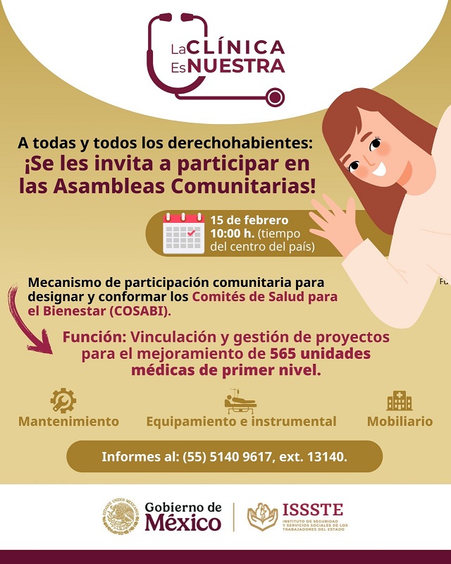 - Este sábado 15 de febrero, a las 10:00 horas, tiempo del centro del país, se convoca a las y los afiliados a asistir a las asambleas comunitarias del programa federal, el cual tiene como objetivo el mejoramiento y equipamiento de unidades médicas