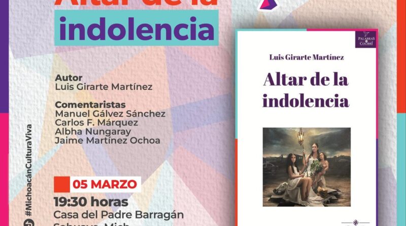 Morelia, Michoacán, 3 de marzo de 2025.- La Secretaría de Educación en el Estado (SEE) y la Secretaría de Cultura de Michoacán (SECUM) se complacen en anunciar la presentación del libro “Altar de la indolencia”, una obra del reconocido poeta Luis Girarte Martínez, publicada bajo el sello de Cuarta República, Editorial de Michoacán. Este evento será de entrada libre y tendrá lugar el 5 de marzo a las 19:30 horas en la Casa del Padre Barragán, ubicada en Sahuayo, Michoacán.