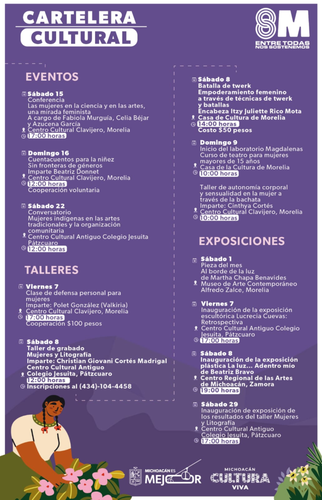Morelia, Michoacán, 4 de marzo de 2025.- La Secretaría de Cultura de Michoacán (Secum) conmemorará el Día Internacional de la Mujer con una cartelera de actividades que incluyen talleres, conferencias, obras de teatro, conversatorios y la entrega de reconocimientos a mujeres de diversas comunidades, con el propósito de visibilizar su labor en el ámbito creativo y artístico.