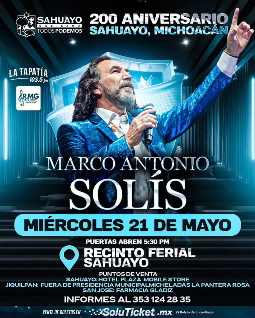 ¡Adquiere ya tus accesos para el World Tour de Marco Antonio Solis y celebraremos el #BicentenarioSahuayo.????Recinto Ferial | ???? 21 de mayo | ¡BOLETOS GRATIS en la zona general al comprar en negocios locales participantes.