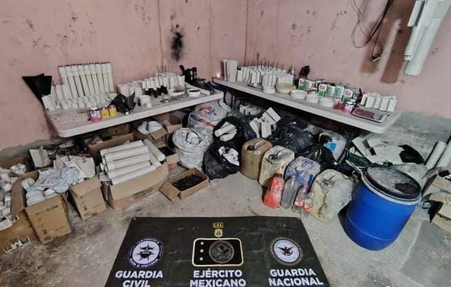 De igual forma dentro del domicilio, agentes estatales y federales decomisaron tres máscaras para soldar, dos taladros de banco, diversos materiales de metal como tubos y placas, así como bidones con líquidos similares a la gasolina, thinner y ácido.