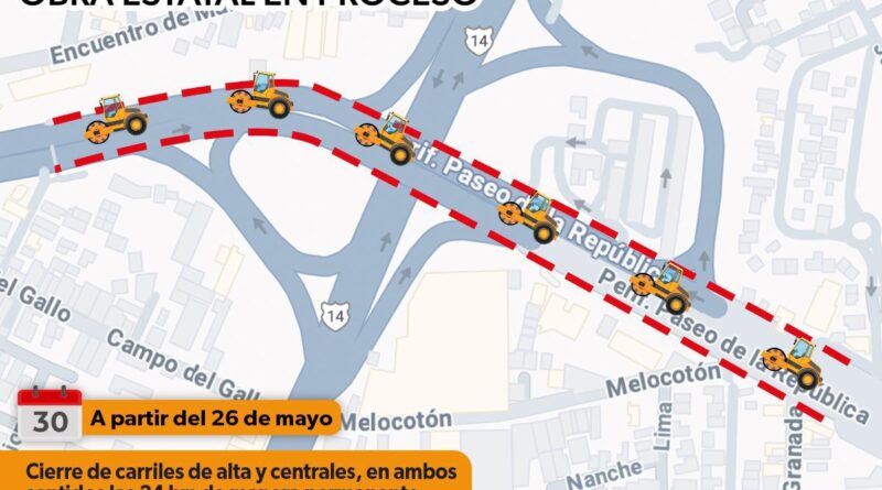 La vialidad estará cerrada en ambos sentidos, las 24 horas y hasta nuevo aviso. Esto se debe al inicio de la construcción y perforación de la rampa con tierra armada, así como de los pilares que soportarán la estructura elevada hacia calzada La Huerta. Todo el trabajo será supervisado por la Dirección de Caminos y Carreteras.