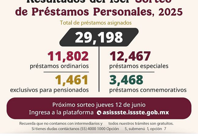 El Instituto de Seguridad y Servicios Sociales de los Trabajadores del Estado (ISSSTE), encabezado por el director general Martí Batres Guadarrama, informa que en el decimotercer sorteo convencional del Programa Anual de Préstamos Personales 2025 se asignaron 29 mil 198 créditos, es decir, salieron todos aquellos que cumplieron los requisitos.