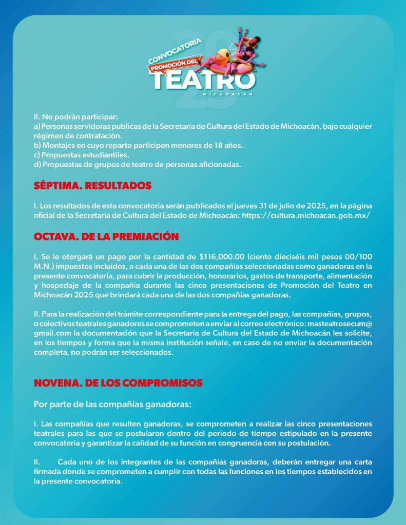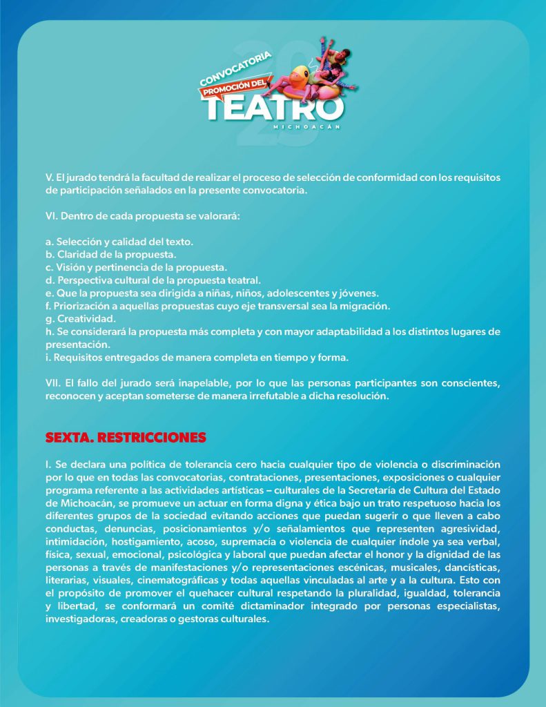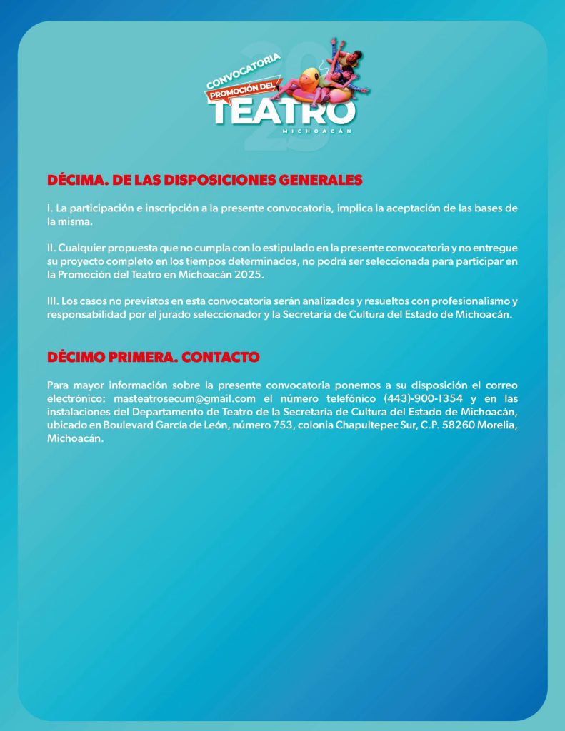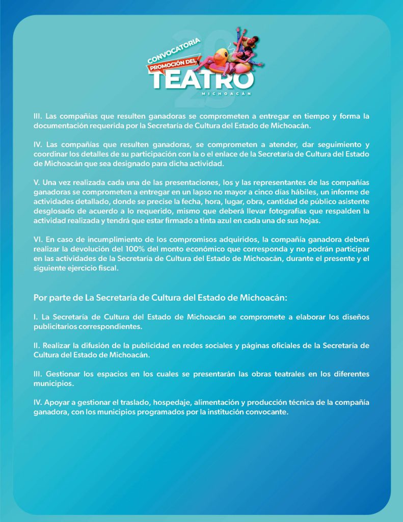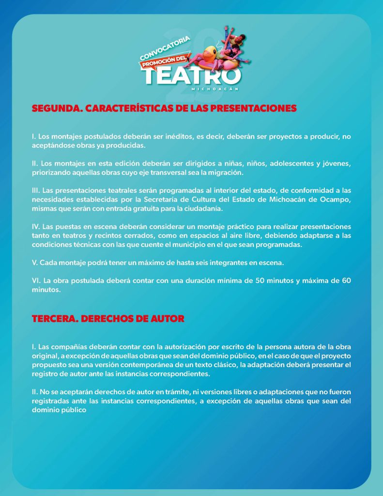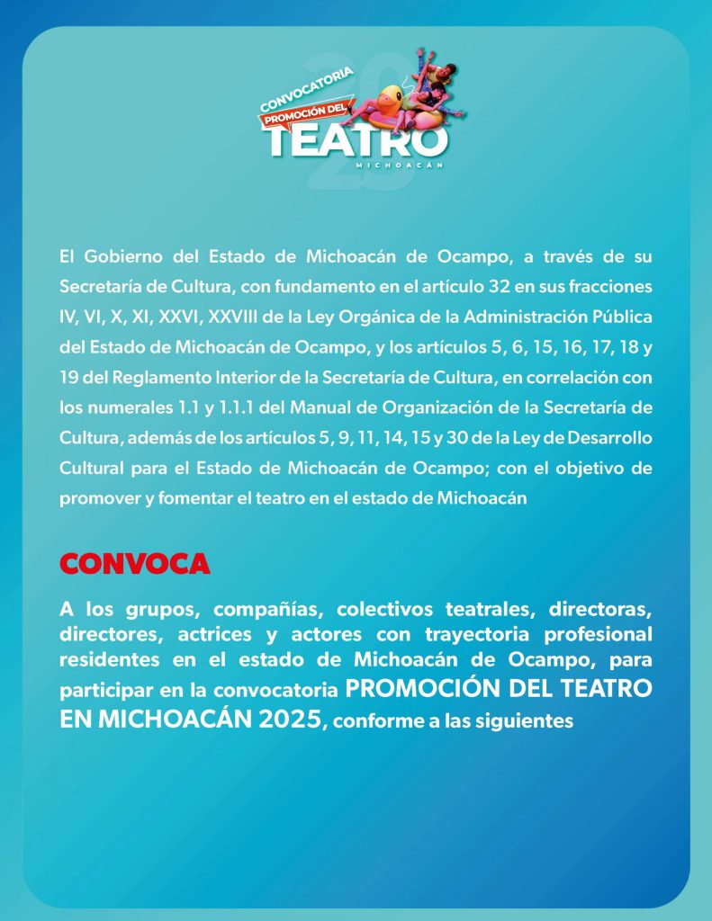 El Gobierno del Estado de Michoacán de Ocampo, a través de su Secretaría de Cultura, con fundamento en el artículo 32 en sus fracciones IV, VI, X, XI, XXVI, XXVIII de la Ley Orgánica de la Administración Pública del Estado de Michoacán de Ocampo, y los artículos 5, 6, 15, 16, 17, 18 y 19 del Reglamento Interior de la Secretaría de Cultura, en correlación con los numerales 1.1 y 1.1.1 del Manual de Organización de la Secretaría de Cultura, además de los artículos 5, 9, 11, 14, 15 y 30 de la Ley de Desarrollo Cultural para el Estado de Michoacán de Ocampo; con el objetivo de promover y fomentar el teatro en el estado de Michoacán