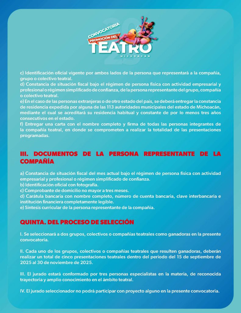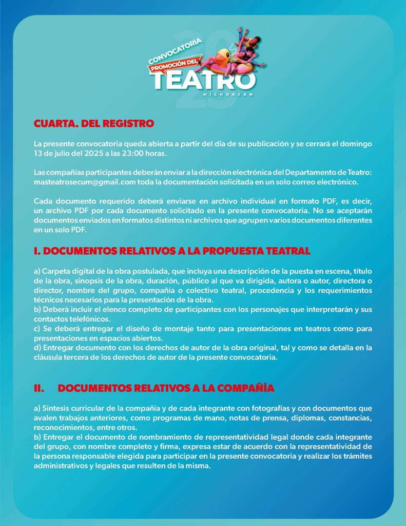 A los grupos, compañías, colectivos teatrales, directoras, directores, actrices y actores con trayectoria profesional residentes en el estado de Michoacán de Ocampo, para participar en la convocatoria PROMOCIÓN DEL TEATRO EN MICHOACÁN 2025