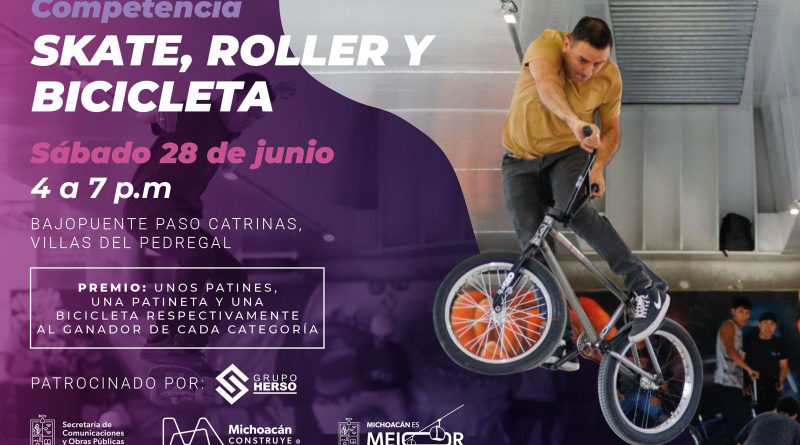 Para fomentar la sana actividad física y promover los deportes extremos, la Secretaría de Comunicaciones y Obras Públicas (SCOP) invita a los jóvenes a participar en la competencia de Skate, Roller y Bicicleta. El evento se realizará este sábado 28 de junio, de 16:00 a 19:00 horas, en la zona de skatepark de Paso Catrinas, a la altura de Villas del Pedregal en Morelia.