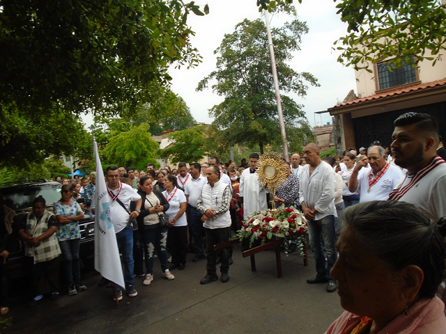Así se recorrieron y caminando por las calles, varias horas, cargando a CRISTO, en su Custodia. CUSTODIADO por, los Grupos Apostólicos como: La Adoración Nocturna con sus Banderas, Grupo de Monaguillos, Matrimonios, Niños, Niñas del Catecismo. Y personas de la Comunidad y Pueblo en general. Y para proteger la CUSTODIA”. Se montó con la ayuda de todos los grupos de la Parroquia. Donde todos protegieron “LA CUSTODIA con el SANTISIMO, el Cristo Vivo”. Todos los Vecinos Feligreses y Personas presentes. A su pesó, se dejaron ver contentos y a la vez Fascinados con Cantos, Gritos, Aplausos y Porras, al paso del CRISTO VIVO por sus Barrios y Calles.