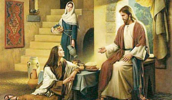 En aquel tiempo, entró Jesús en un poblado, y una mujer, llamada Marta, lo recibió en su casa. Ella tenía una hermana, llamada María, la cual se sentó a los pies de Jesús y se puso a escuchar su palabra. Marta, entre tanto, se afanaba en diversos quehaceres, hasta que, acercándose a Jesús, le dijo: “Señor, ¿no te has dado cuenta de que mi hermana me ha dejado sola con todo el quehacer? Dile que me ayude”.