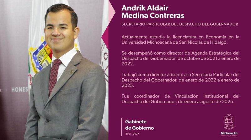 Medina Contreras de 23 años, estudia la licenciatura en Economía en la Universidad Michoacana de San Nicolás de Hidalgo (UMSNH); se desempeñó como director de Agenda Estratégica del Despacho del Gobernador, de octubre de 2021 a enero de 2022.