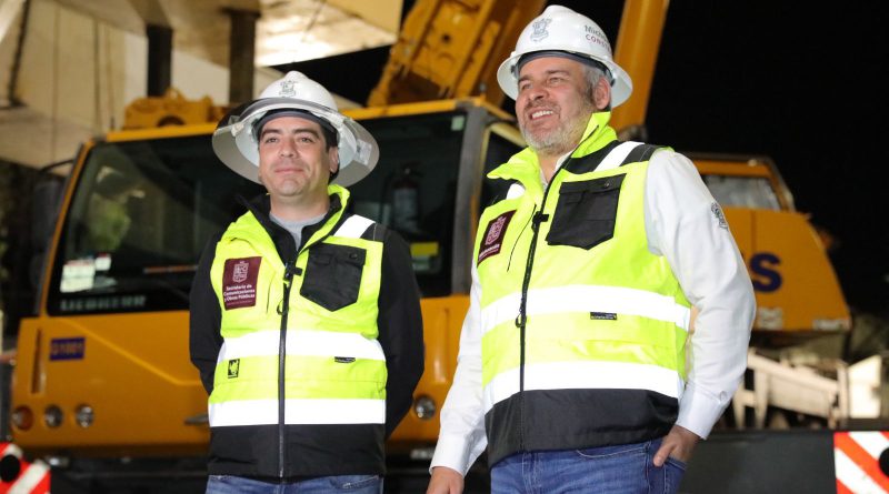 Durante el recorrido realizado con Rogelio Zarazúa Sánchez, secretario de Comunicaciones y Obras Públicas (SCOP) la noche de ayer sábado, el mandatario detalló que con la colocación de esta última trabe de un total de 20 y que comprenden 44 metros de longitud cada una, continúa el proceso de conclusión del primero de dos puentes.