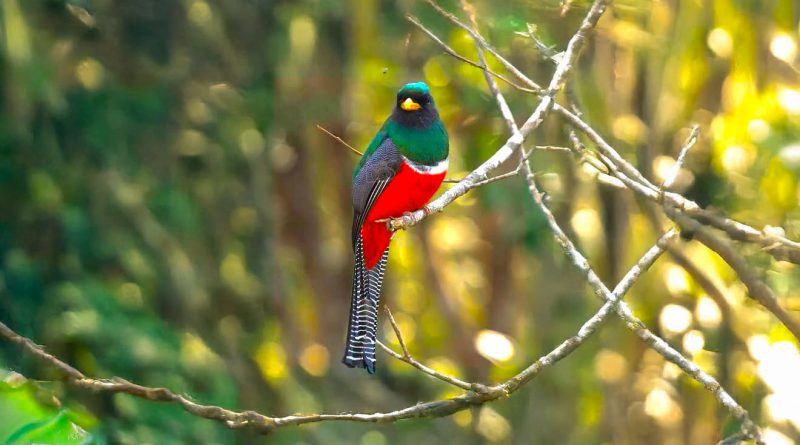 • Plumaje tricolor: El macho ostenta un pecho y espalda de color verde metálico, un vientre rojo intenso y una franja blanca que divide ambos tonos, evocando la bandera de México.