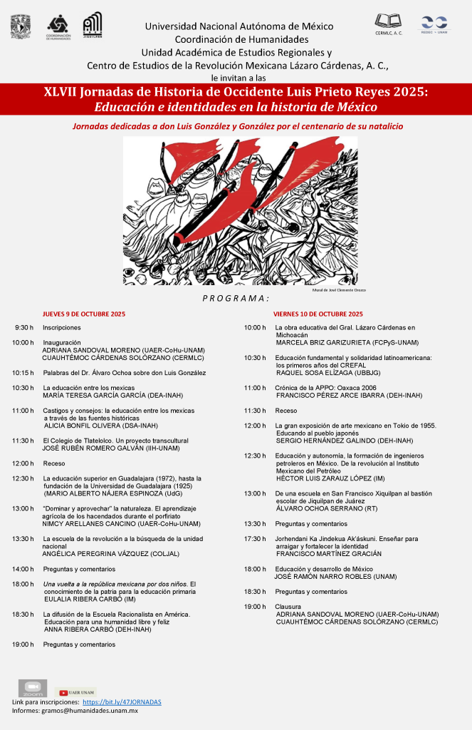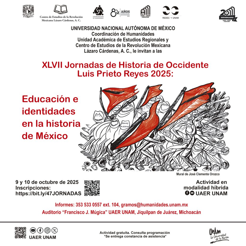 Con la finalidad de dar a conocer y divulgar los trabajos recientes sobre acontecimientos históricos, políticos y sociales, se realizarán las XLVII Jornadas de Historia de Occidente Luis Prieto Reyes 2025, el tema de este año es: Educación e identidades en la historia de México, organizadas por la Unidad Académica de Estudios Regionales (UAER) de la Coordinación de Humanidades (CoHu)- Universidad Nacional Autónoma de México (UNAM) y el Centro de Estudios de la Revolución Mexicana Lázaro Cárdenas A.C (CERMLC).