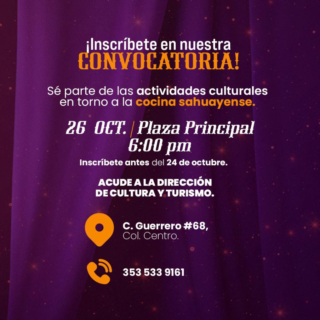 Para participar, solo hay que inscribirse antes del 24 de octubre acudiendo a la Dirección de Cultura y Turismo, ubicada en Calle Guerrero #68, Col. Centro. También puedes pedir más informes al 📲 353 533 9161.