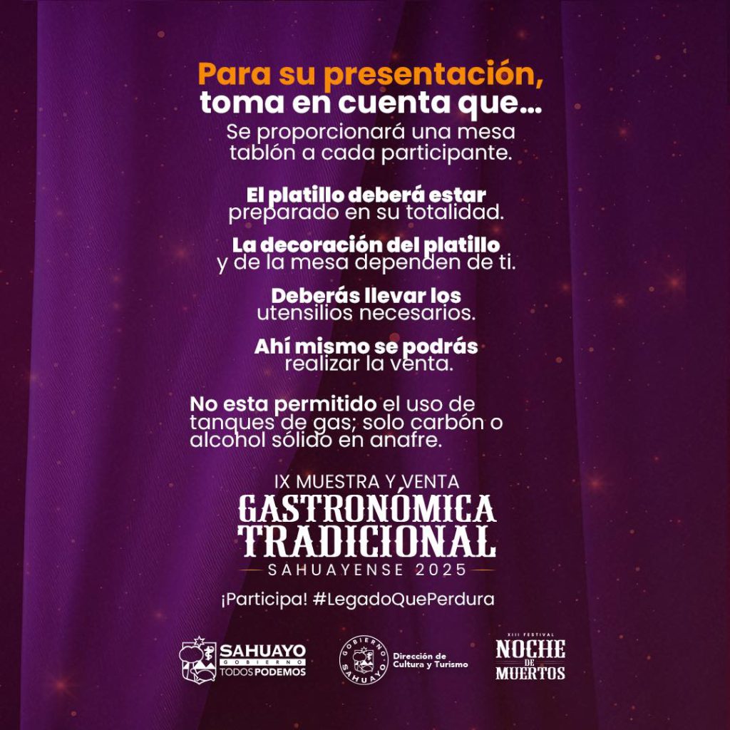 Sahuayo, Michoacán. Con el objetivo de preservar y difundir el patrimonio culinario de la región, el próximo 26 de octubre se llevará a cabo la VIII Muestra y Venta Gastronómica Tradicional Sahuayense en la Plaza Principal, como parte del XIII Festival del Día de Muertos “Estaré Ahí Por Siempre”. La actividad busca fomentar el conocimiento y valoración de la gastronomía local como una forma viva de identidad cultural, a la vez que ofrece una oportunidad para que las y los participantes obtengan un ingreso adicional.
