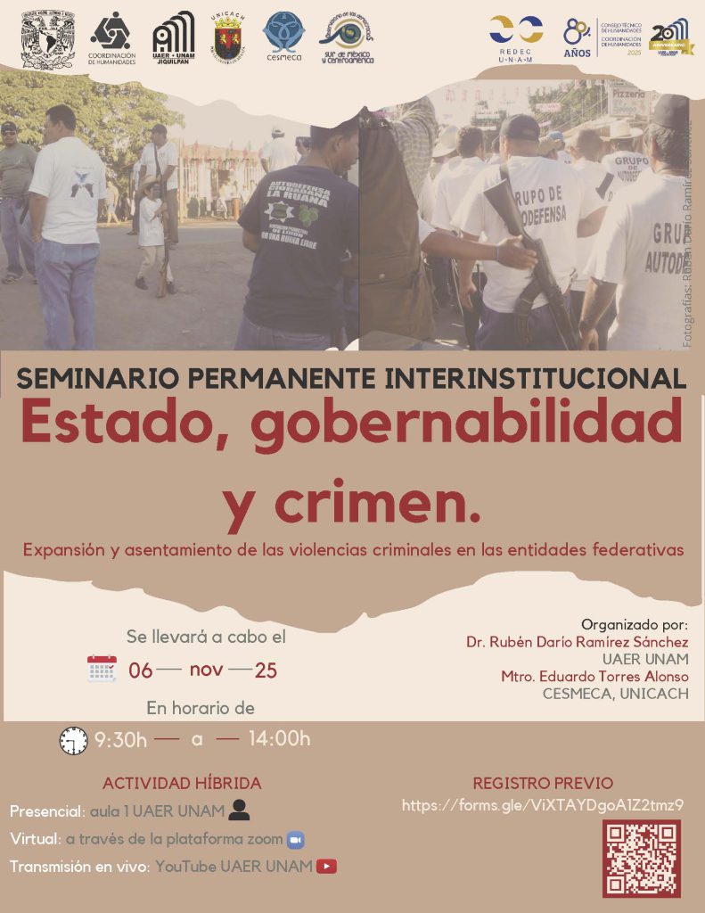 El próximo 6 de noviembre de 2025, la Universidad Nacional Autónoma de México (UNAM), a través de su Unidad Académica de Estudios Regionales (UAER), será sede del seminario permanente interinstitucional “Estado, gobernabilidad y crimen. Expansión y asentamiento de las violencias criminales en las entidades federativas”, un espacio que busca generar diálogo académico sobre el fenómeno del crimen organizado en el país.
