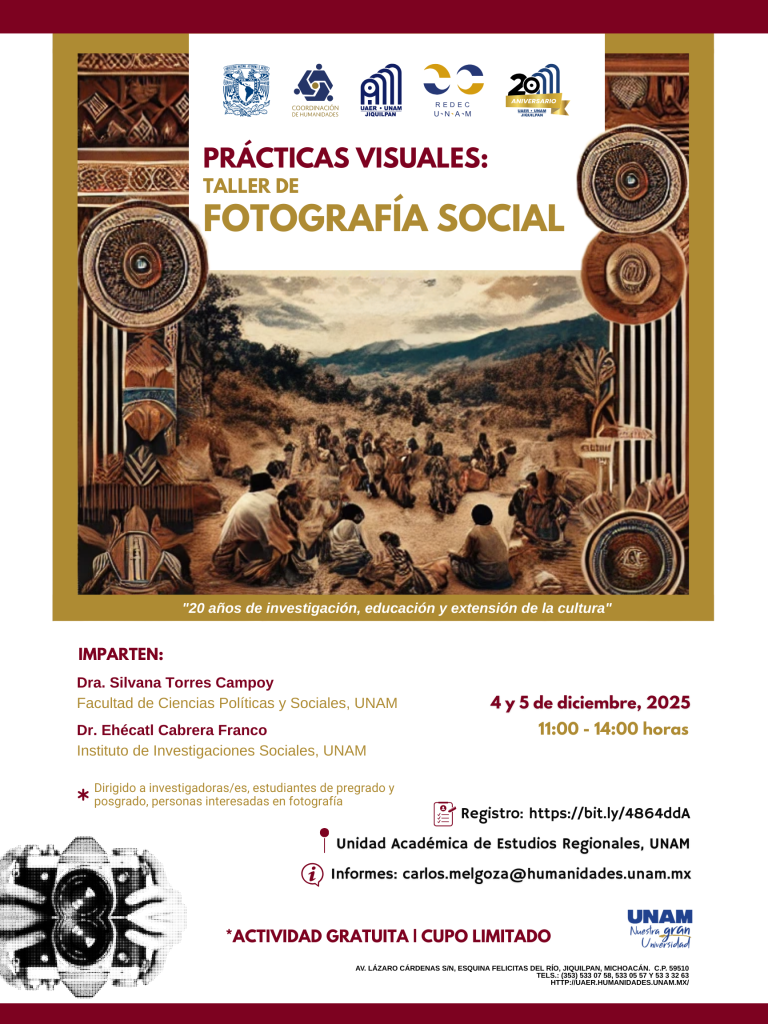 La Unidad Académica de Estudios Regionales de Jiquilpan invita a investigadores, estudiantes de pregrado y posgrado, así como a personas interesadas en la fotografía, a participar en el Taller de Fotografía Social, que se llevará a cabo los próximos 4 y 5 de diciembre, de 11:00 a 14:00 horas, en las instalaciones de la unidad académica.