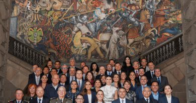 Uruapan, Michoacán, 3 de diciembre de 2025.- El gobernador Alfredo Ramírez Bedolla; el secretario de Seguridad y Protección Ciudadana del Gobierno de México, Omar García Harfuch, y el general Ricardo Trevilla Trejo de la Defensa Nacional, encabezaron reunión de seguimiento a las acciones de seguridad del Plan Uruapan con la participación de la presidenta municipal, Grecia Quiroz y el sector productivo.