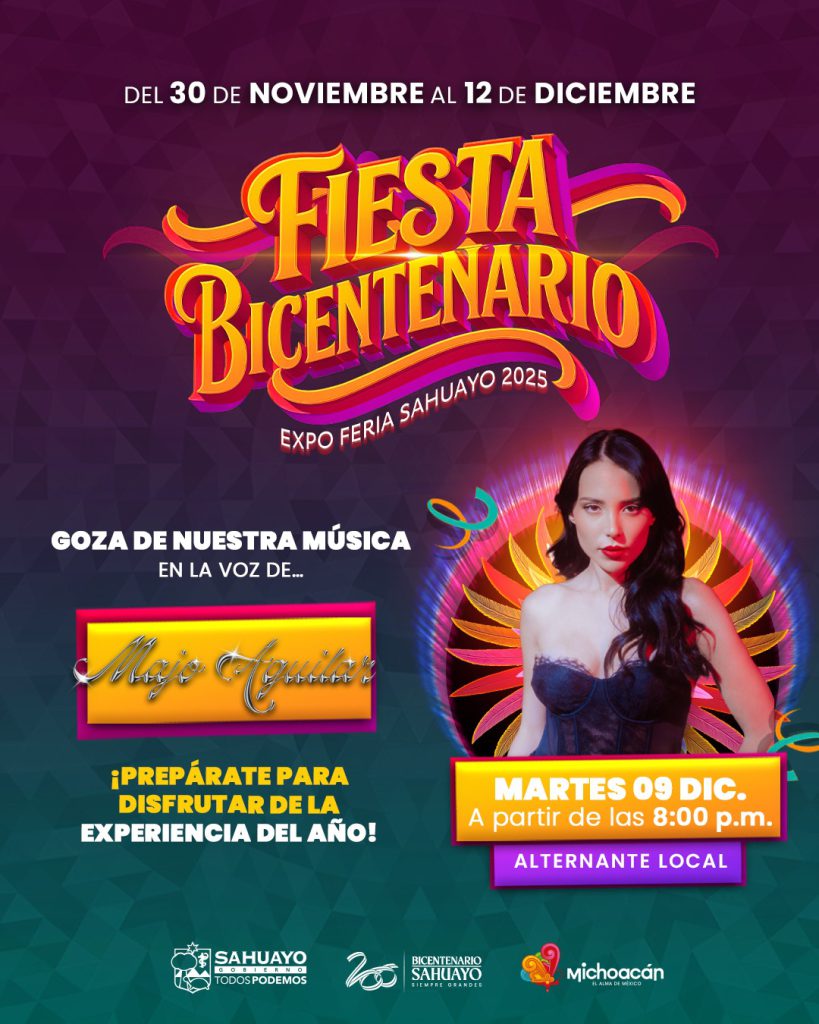 Sahuayo, Michoacán. — La celebración del Bicentenario sigue alcanzando momentos memorables, y esta noche promete ser uno de ellos. La talentosa Majo Aguilar se presentará hoy, martes 9 de diciembre, en el Teatro del Pueblo de la Expo Feria Bicentenario Sahuayo 2025, lista para cautivar al público con su voz llena de sentimiento y ese inconfundible estilo mexicano que ha conquistado corazones en todo el país.
