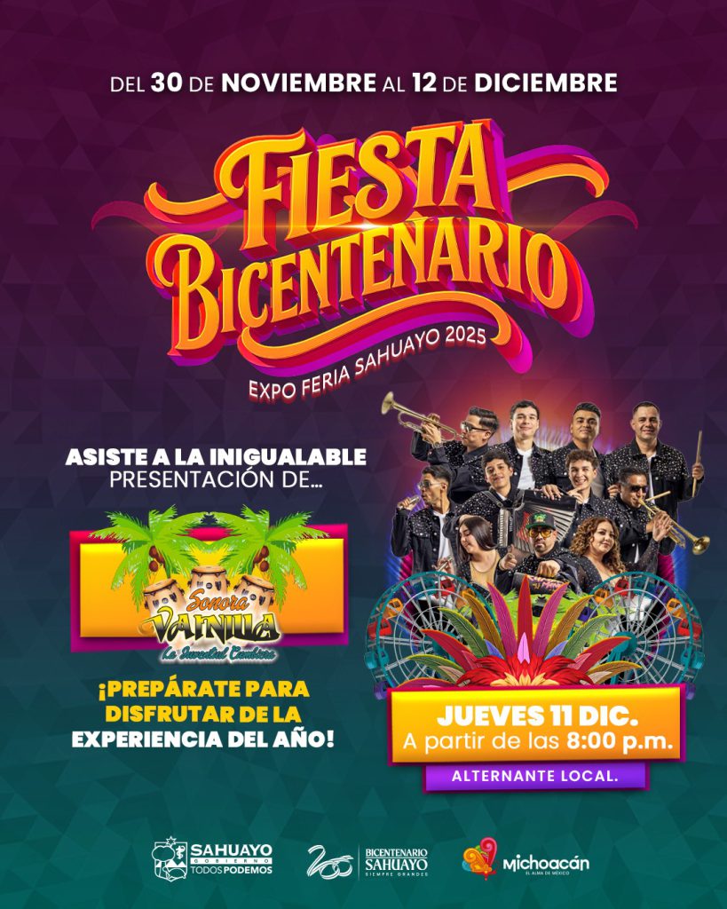 La #FiestaBicentenario sigue escribiendo su historia una noche a la vez… y hoy jueves 11 de diciembre, esa historia se llena de ritmo, juventud y sabor con la llegada de La Internacional Sonora Vainilla, La Juventud Cumbiera que conquistará el escenario principal de la #ExpoFeriaSahuayo2025.