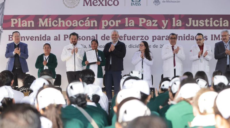 Morelia, Michoacán, 16 de diciembre de 2025.- El gobernador Alfredo Ramírez Bedolla y el director general del IMSS, Zoé Robledo Aburto, entregaron 270 bases a personal de salud, para reforzar los servicios que se ofrecen en las unidades médicas rurales y urbanas del Instituto Mexicano del Seguro Social en el estado, como parte del Plan Michoacán por la Paz y la Justicia.