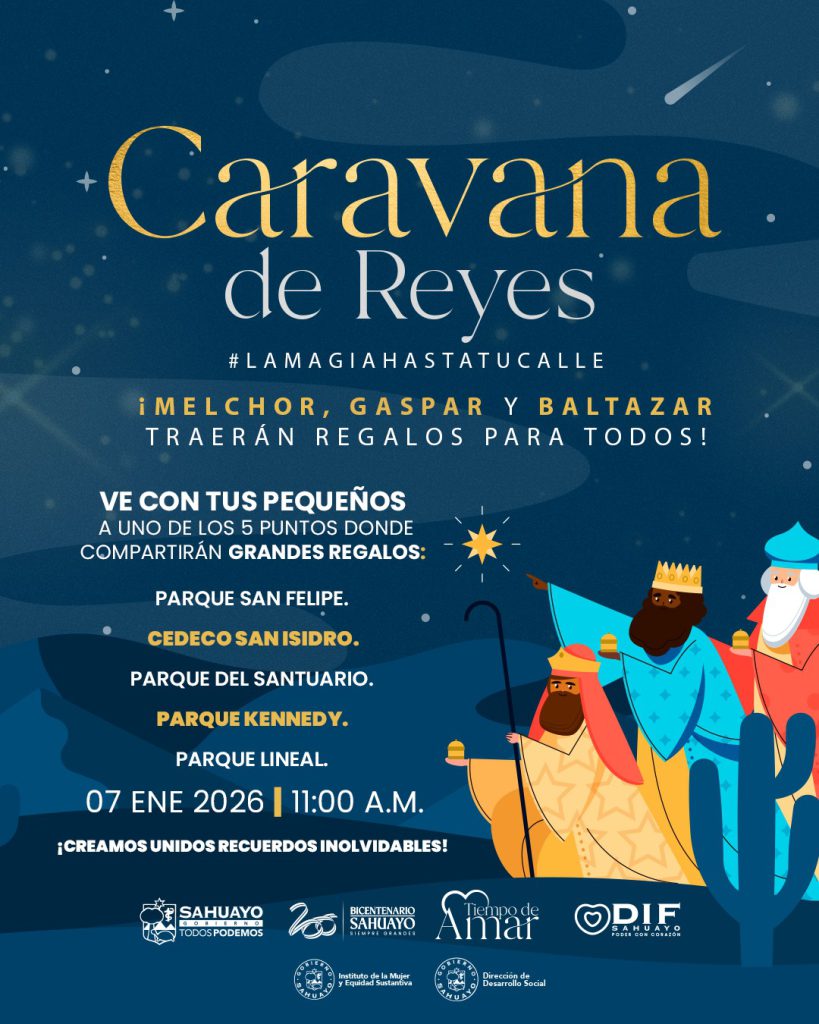 Sahuayo, Michoacán.— La tradición de los Reyes Magos volverá a reunir a las familias sahuayenses con la esperada Caravana de Reyes, que se llevará a cabo este lunes 6 de enero, llevando alegría, ilusión y convivencia comunitaria a distintos puntos del municipio.