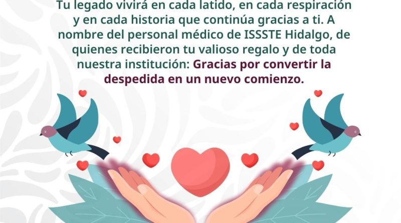 Pachuca de Soto, Hidalgo, a 15 de enero de 2026.- El Hospital General (HG) “Dra. Columba Rivera Osorio” en Pachuca, Hidalgo, adscrito al Instituto de Seguridad y Servicios Sociales de los Trabajadores del Estado (ISSSTE), a cargo del director general Martí Batres Guadarrama, registró la primera donación de tejido del 2026, gracias a la generosidad de una derechohabiente, cuya voluntad fue dar a otras personas una segunda oportunidad de vida.